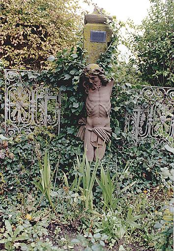 Vue du corps du Christ dans le jardin, derrière lui, vestiges du banc de communion.