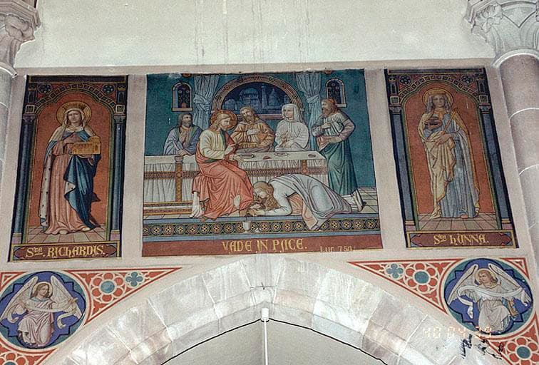 Vue d'ensemble de peintures monumentales : Sainte Richarde / Le lavement des pieds / Sainte Hunna.