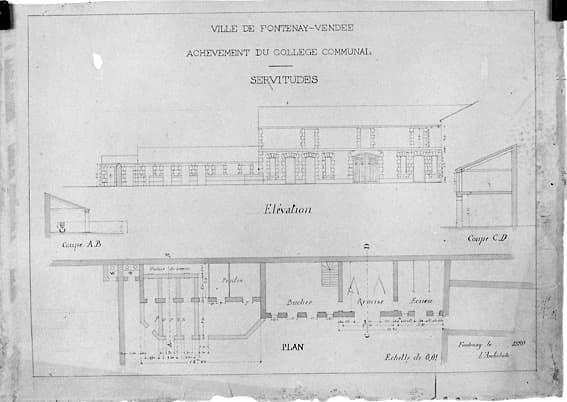 Achèvement du collège. Servitudes : plan, élévation et coupes au 1/100e, n.s. [Arsène Charier], 1881.