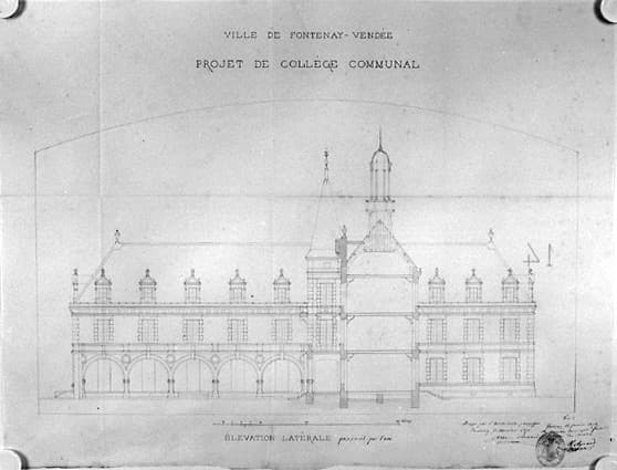 Projet initial. 'Elévation latérale passant par l'axe', au 1/100e, signée et datée Arsène Charier, le 22 décembre 1871. (A.C. Fontenay-le-Comte, 4 M 1).