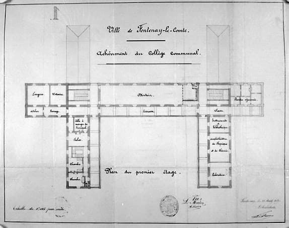 Achèvement du collège. Plan du premier étage au 1/200e, signé et daté A.Filuzeau, le 10 août 1890. (A.C. Fontenay-le-Comte, 4 M 3).