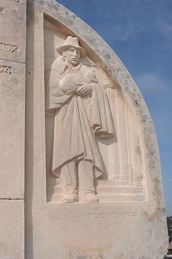 Le bas-relief de droite est intitulé li pastre di Baus, un jeune berger debout devant le portail d'une église, tient dans ses bras un agneau.