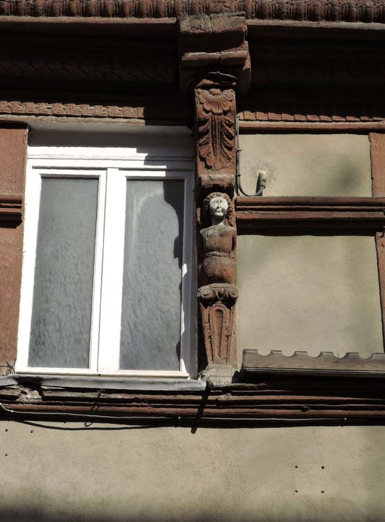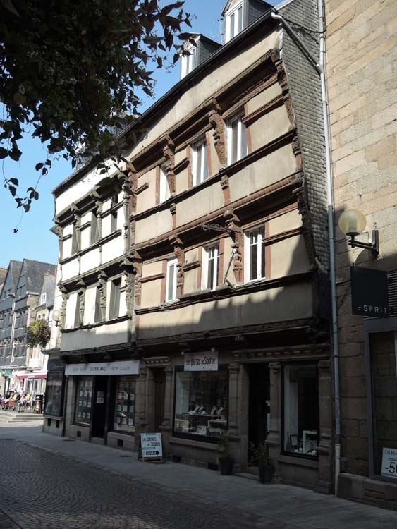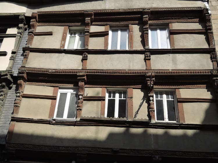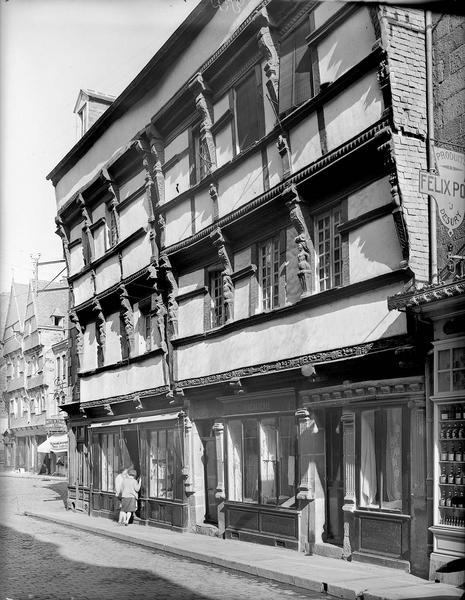Maison à pans de bois présentant une façade du 17e siècle aux montants et sablières sculptés. Le rez-de-chaussée est occupé par des boutiques et deux étages montent en encorbellements successifs. Les sablières s'ornent de cartouches et d'entrelacs. Les poteaux supportant les saillies sont ornés de cariatides engainées et de consoles. Au rez-de-chaussée, les piles en granit sont ornées de pilastres ioniques encadrant les portes.