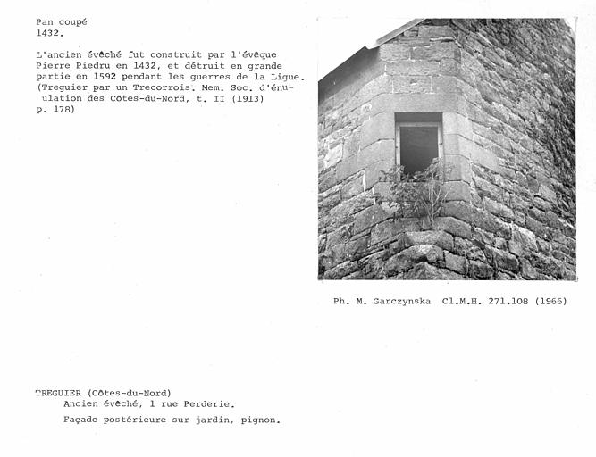L'évêché de Tréguier a été crée en 850 par Saint-Tugdual. Les bâtiments actuels remontent au 17e siècle, reconstruits en 1608 à la demande de l'évêque Adrien d'Amboise. En 1700, l'évêque Olivier Jégou de Kervilio agrandit le palais en bâtissant, au nord de l'escalier d'honneur, une aile destinée à contenir des remises à rez-de-chaussée et la secrétairerie à l'étage. Il commença l'édification d'un nouveau bâtiment au nord du cloître, mais le projet ne fut exécuté qu'en partie en 1794. L'évêché se compose de trois ailes entourant la cour au nord de l'église. Le bâtiment nord se termine par deux pavillons carrés. Dans le pavillon ouest, se trouve le grand escalier d'honneur. Les ailes nord et Est étaient occupées par des logements. L'aile ouest était occupée par les communs. La salle Renan, ancienne salle synodale, conserve ses boiseries du début du 17e.