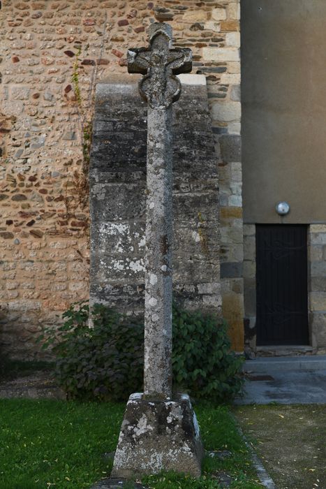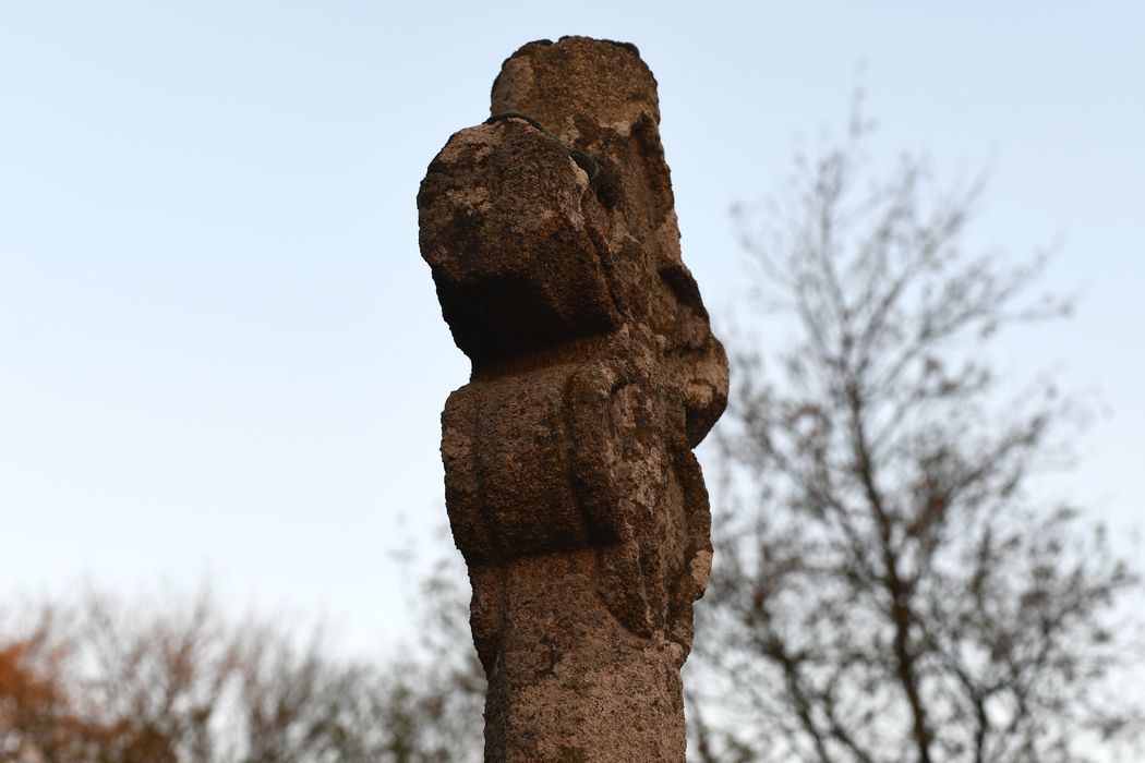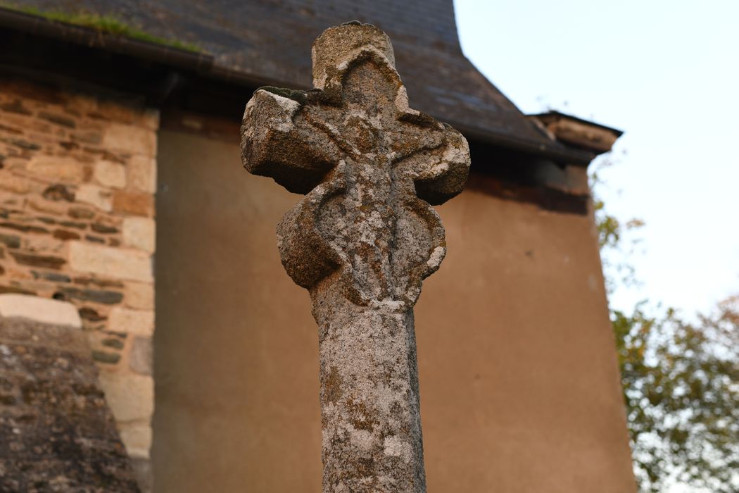 Croix octogonale en granit figurant un Christ dans un encadrement constitué par deux trilobes opposés l'un à l'autre. Le fût octogonal repose sur un socle formé d'un tronc de pyramide carré dont les angles supérieurs sont abattus. Ce socle repose sur une marche.