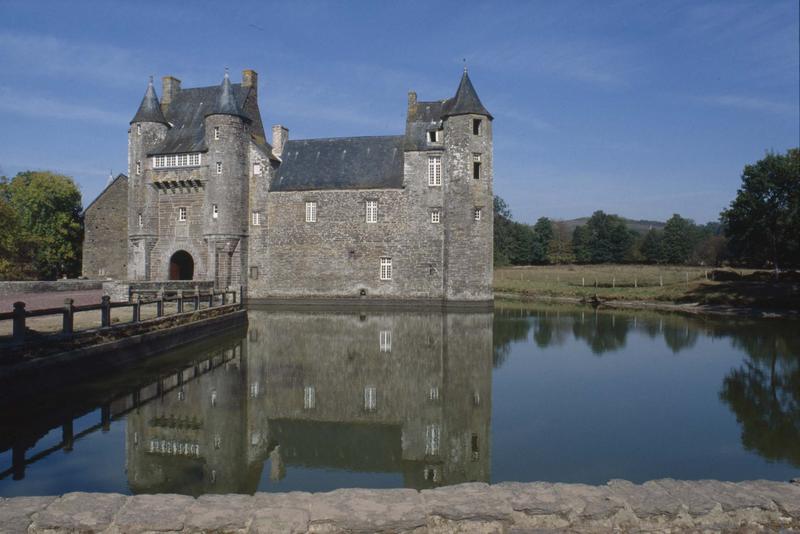 Le château paraît appartenir majoritairement au 15e siècle. Il se compose de deux bâtiments disposés en équerre. La porte d'entrée principale, en ogive, est flanquée de deux tourelles élevées en encorbellement sur des contreforts, et reliées à la partie supérieure par un chemin de ronde à mâchicoulis. Deux tours polygonales accompagnent les autres bâtiments. La construction est entièrement en schiste, sans aucune décoration. A l'intérieur, il existe une salle voûtée dont les murs seraient décorés de fresques. Boiseries Louis XIII et Louis XIV. Face à ces bâtiments se trouve un bâtiment rectangulaire servant de ferme, auquel est adossée une petite chapelle.