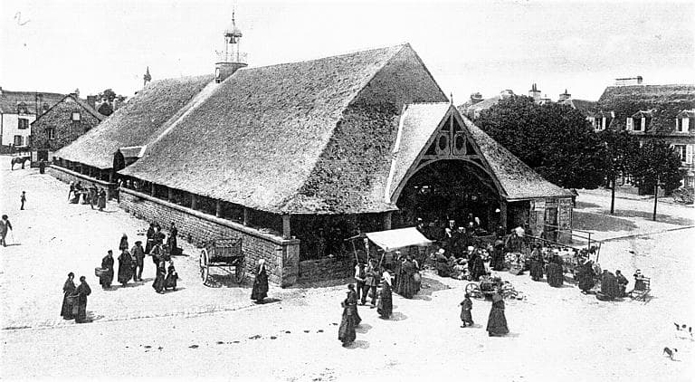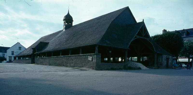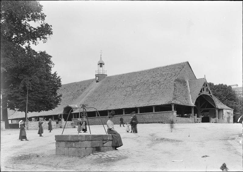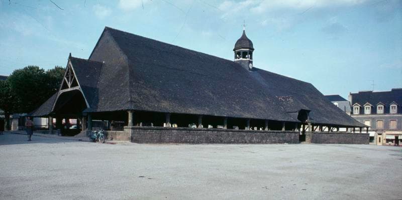 Anciennes halles formant trois nefs supportées par deux pans de bois dans la partie centrale et par de courts piliers en granit reposant sur un mur bahut à l'extérieur. La charpente ne semble pas antérieure au 17e siècle. L'allée centrale se termine par deux porches en charpente à entraits retroussés.