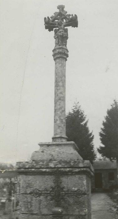 Fût polygonal avec moulurations faisant chapiteau ou bague sur lequel repose la croix proprement dite. Le Christ d'un côté et la Vierge de l'autre sont surmontés d'un fronton rectiligne à crochets avec angelots comme amortissement au-dessus et redents ajourés en-dessous. La Vierge et Saint-Jean sont accolés au tronc, contre le Christ.