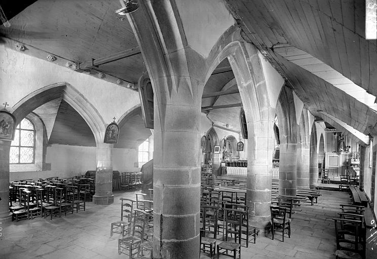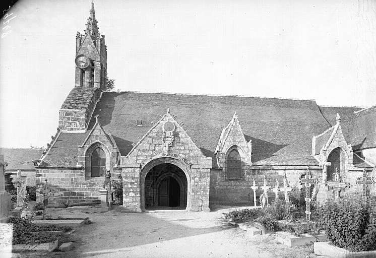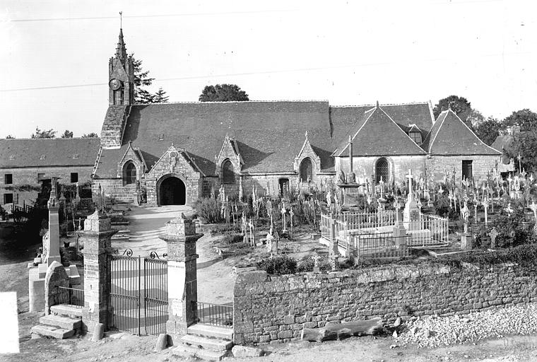 Eglise dont le porche sud renferme deux sablières sculptées : l'une entre deux léopards donne la date de 1527 pour la réfection de l'église. Au-dessus du cintre de la baie, un fleuron sur lequel posent deux animaux tenant un blason ou parchemin. Une fenêtre porte la date de 1666. Le pignon d'entrée présente deux portes géminées dans un grand arc plein-cintre. Clocher à jour de faible dimension.