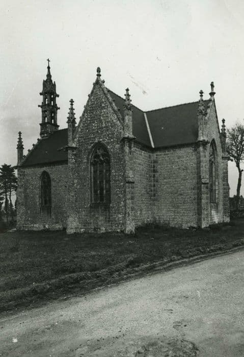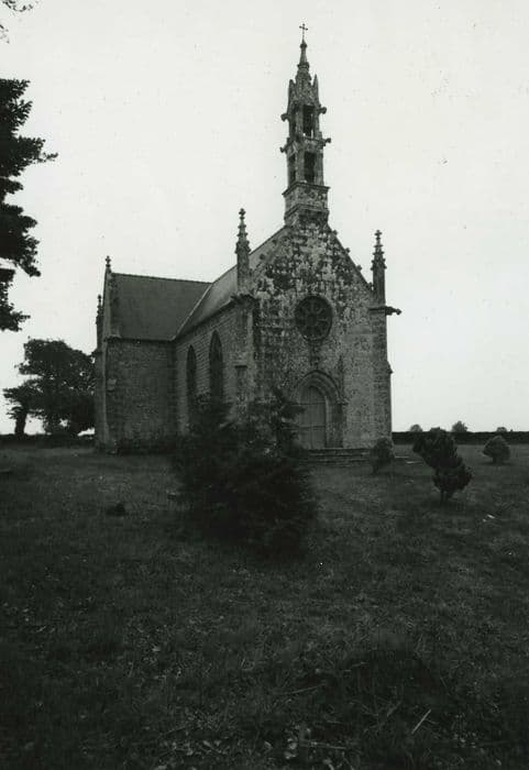 Cette chapelle est un bon exemple d'architecture néogothique de la fin du 19e siècle. Elle remplace l'ancienne chapelle du manoir de Kergoat, détruite en 1881. C'est un édifice en croix latine avec chevet plat et transepts peu saillants. Le mur pignon s'ouvre par un portail à arc en tiers-point surmonté d'un vitrail circulaire. A l'intérieur, la tribune exécutée par Lebrun comporte une frise qui évoque les sept péchés capitaux. Dans les écoinçons des arcs sont représentés des personnages signifiant les vices. Voûte en berceau de bois avec section d'arc en tiers-point. Les voûtes du carré du transept sont montées sur ogives de bois. Haut clocher à entablement avec deux étages d'ouvertures et gâbles ouvragés.