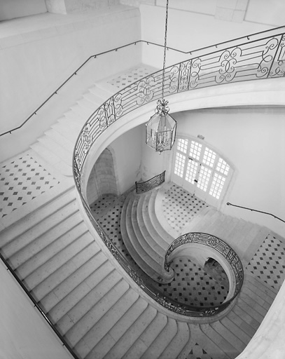 escalier dans-oeuvre : escalier tournant à retours avec jour, en maçonnerie, suspendu, sur voûte