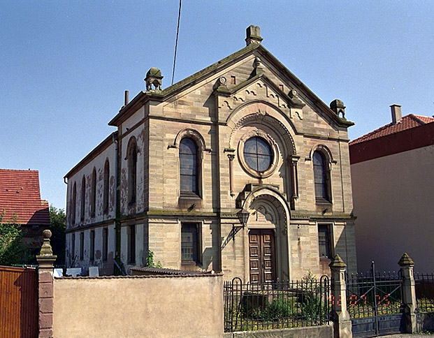 Synagogue datée de 1904 au-dessus de la porte, réalisée par Wolk & Falk, architectes de Strasbourg (mention sur une chaîne d'angle) ; date 1954 au-dessus de la porte faisant référence à la restauration effectuée après la 2e guerre mondiale par Cromback