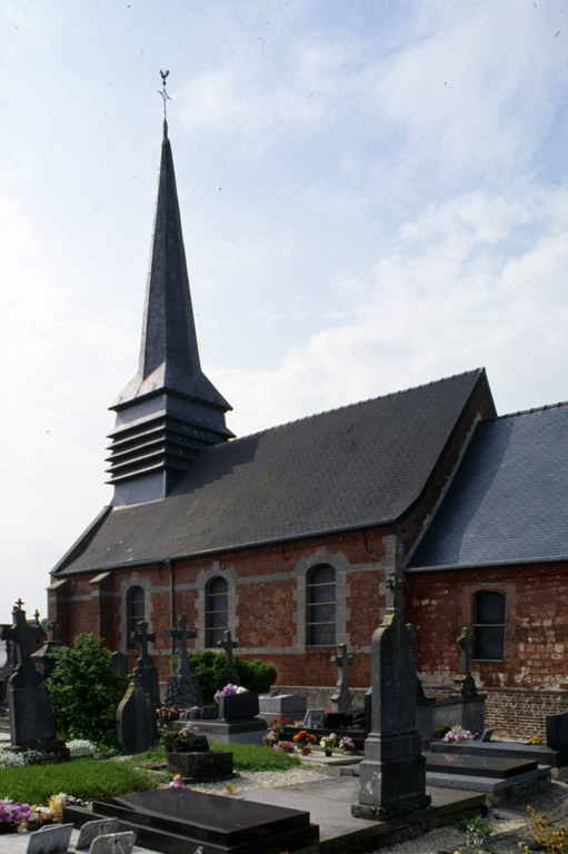 Nef couverte d'un plafond sous un toit à longs pans avec pignon couvert et pignon découvert. Choeur en pierre de taille calcaire, couvert d'une fausse voûte en berceau sous un toit à deux pans à pignon couvert. Sacristie avec toit à deux pans à pignon découvert. Essentage d'ardoise sur le clocher. Socle de la croix de cimetière en brique enduite de ciment. Croix en fonte.