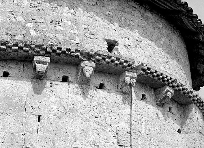 sujet : billettes, support : 2 registres de cordon au-dessous et au-dessus des fenêtres du choeur ; sujet : feuille d'eau, volute, sphère, support : culots du vaisseau latéral gauche ; sujet : feuille d'eau, volute, sphère, animal fantastique, support : culots du vaisseau latéral droit ; sujet : tête d'homme, support : 2e travée de la nef, culot sud-est