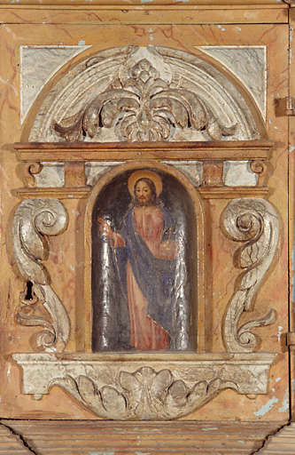 Nef : colonnes engagées avec chapiteaux à crochets supportant la naissance des nervures d'un voûtement ; on observe également ces chapiteaux englobés dans la maçonnerie de la façade ouest, ce qui tendrait à prouver que la nef a été plus longue ; au nord, implantation d'un bas-côté qui communique avec la nef par de grandes arcades ouvertes dans le mur ; chevet plat percé de 2 baies ; traces de faux appareil visibles des combles car pas de badigeon à ce niveau ; restes de peintures tardives (16e siècle) à l'intrados d'une arcade entre nef et bas côtés (armoiries, personnage)