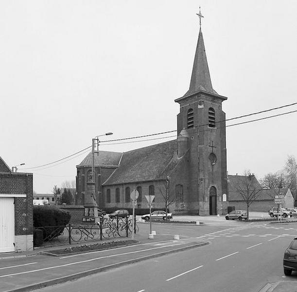 L'église est située à l'angle de la route de Roubaix et la rue Neuve, en retrait, et orientée nord-sud. Le mur de clôture a disparu. De part et d'autre de l'église sont disposés le presbytère et un enclos funéraire. L'élévation reflète les deux campagnes de construction de l'édifice : le grand volume abritant la nef et les bas-côtés, précédé d'une tour-porche imposante, contraste avec celui du transept et choeur. En effet, les murs sobres des bas-côtés élevés en brique sont plus bas que ceux du choeur et du transept, tous deux à contreforts. Le niveau de grès des bas-côtés est conservé sur quelques assises pour le choeur et le transept. Les bas-côtés sont éclairés par des baies simples surbaissées, alors que celles des croisillons arrondis et du choeur sont plus hautes et en plein cintre. La nef et les bas-côtés sont couverts d'une toiture à très longs pans en matériau synthétique, la pente du toit du transept et du choeur est moins importante. La tour-porche a un bandeau et une corniche en pierre blanche et le portail est encadré par un chaînage en pierre bleue avec clé datée 1759. Elle est couverte d'une flèche polygonale à égout retroussé en ardoise. Le volume intérieur a été homogénéisé par le décor réalisé lors de la reconstruction du choeur et du transept. La nef est couverte d'une voûte en berceau plein cintre à doubleaux et les bas-côtés de voûtes d'arêtes, qui ont remplacé des voûtes en demi-berceau en 1867. Des colonnes ioniques à tambours, en pierre calcaire locale appelée pierre bleue, soutiennent les arcs en plein cintre de la nef. Elles sont gravées des lettres F et A, marques de tâcherons rares pour l'époque.