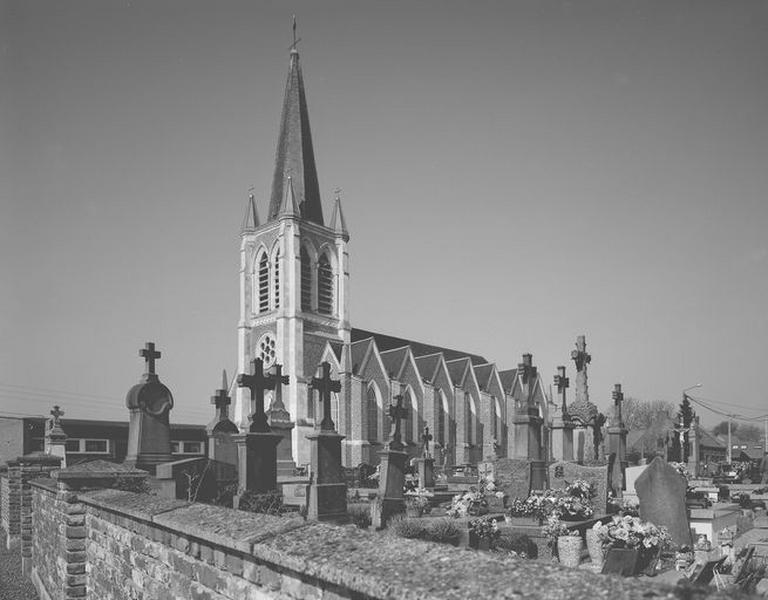 Le plan rectangulaire à 3 vaisseaux et 5 travées, adjoint d'une abside semi-circulaire, est précédé d'une tour de plan carrée peu saillante. Celle-ci est en brique, avec des contreforts en pierre blanche d'Avesnes-le-Sec (Nord) , un portail couronné d'une ogive et d'une rosace de style néogothique. L'ensemble est en brique sur un soubassement de quelques assises en grès. Une toiture complexe de doubles bâtières entrecroisées en ardoise de Fumay couvre les bas-côtés. La nef et les bas-côtés sont couverts de voûtes d'ogives bombées retombant sur des colonnes en fonte, creuses, particularité très novatrice pour l'époque - rappelons la première utilisation de la fonte par Boileau dans l'église Saint-Eugène à Paris, en 1854-55 - et la région. La chaire a disparu et semble avoir été partiellement réutilisée pour l'autel. L'église conserve quatre statues de plâtre de saint Louis Gonzague, saint Dominique, saint François d'Assise, saint Antoine de Padoue et le vaisseau sud accueille une Nativité (1861) de Félix Dumortier (1801 Tournai - 1868 Bruxelles).£Il s'agit vraisemblablement d'une des premières oeuvres de l'architecte valenciennois Louis Dutouquet, très actif ensuite dans la région.£Le cimetière est situé sur le flanc nord-ouest.