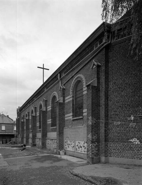 De style néo-roman, l'église Saint-Philibert s'inscrit de manière modeste dans une perspective urbaine, face à la rue Michel-Ange. La façade, ornée d'une rosace, n'a jamais été achevée : le clocher qui devait la terminer n'a en effet jamais été érigé, faute de financements (des traces de reprise sont visibles) et du fait de la Première Guerre mondiale. L'édifice adopte un plan en croix latine. La nef, couverte d'une fausse voûte plâtrée, comporte quatre travées, dotées de collatéraux, couverts de fausses voûtes d'arêtes en plâtre. Les grandes arcades de la nef, en plein cintre, à arêtes vives, reposent sur des colonnes dont les chapiteaux présentent des corbeilles à volutes et à palmettes. Le chevet, à trois pans, comporte trois baies ; il est couvert d'une fausse voûte d'ogives en plâtre. Le décor extérieur se limite à un jeu de briques polychromes au-dessus des baies et constituées en bandes doubles le long des élévations. Une sacristie en brique a été accolée sur le flanc nord de l'église.£ L'ancien presbytère, situé à l'ouest de l'église, 5 rue Berthelot, est une maison de brique polychrome à un étage et trois travées en façade. Au rez-de-chaussée, une extension a été réalisée à l'est, pour le logement du vicaire et une salle de cathéchisme. La façade sur jardin, cimentée, présente deux travées. La toiture est en tuiles mécaniques.