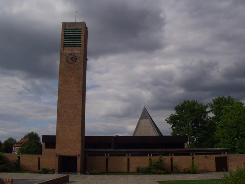 Léglise est un édifice bas élevé en brique et couvert dune terrasse. Elle est signalée par un haut clocher de plan carré en brique, surmontant le porche dentrée. Lédifice sinscrit dans un plan carré. Lassemblée est disposée en éventail autour du choeur situé sur un podium à lun des angles. Lautel est éclairé par un lanternon triangulaire. Le baptistère est situé près de lentrée à langle opposé à celui du choeur et entouré dun cloître fermé. Une chapelle de semaine, les sacristies et des salles annexes sont situées sur le pourtour du bâtiment.