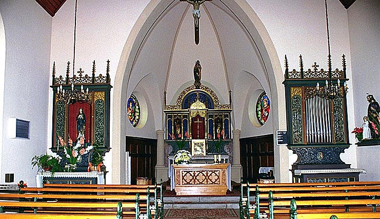 Clocher-porche demi-hors-oeuvre. Sur la nef, lambris de couvrement en arc brisé. Sur le choeur, fausse-voûte d'arêtes, portée par 4 colonnes en plâtre peint.