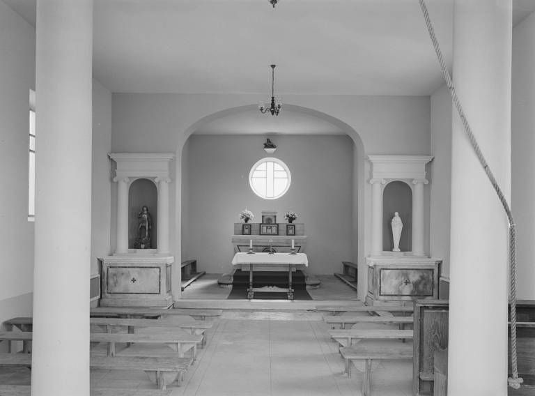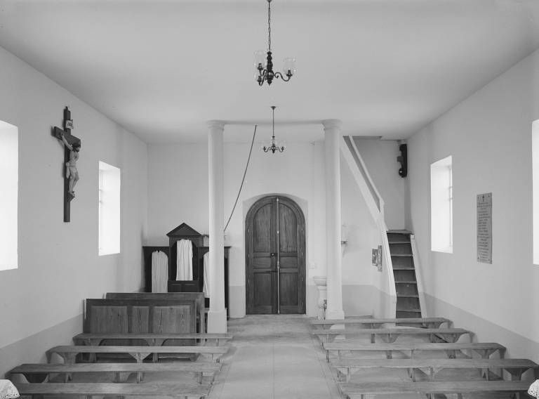 Edifice plafonné ; l'escalier d'accés au comble occupe l'angle antérieur gauche de la nef. Un arc en anse-de-panier sépare la nef du choeur plus étroit. Comme le prévoyait le devis de Fondet, le clocher en charpente repose d'un côté sur le mur pignon, de l'autre sur deux piliers.