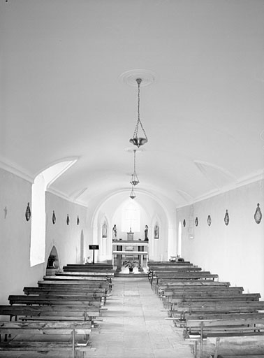 Toutes les élévations sont en grand appareil de moellon de calcaire à l'exception du chevet qui est en pierre de taille ; l'unique vaisseau est voûte en berceau en anse de panier à lunettes et couvert en longs pans ; le choeur, voûte en ogives, est couvert d'une croupe ronde ; l'auvent protégeant la partie basse de la façade est couvert en appentis