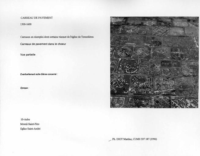 © Monuments historiques, 1992. Cette notice reprend intégralement les termes de l’arrêté de protection au titre des Monuments historiques. Elle répond à l’obligation réglementaire du ministère de la Culture d’établir la liste générale des immeubles protégés (art. R. 621-80 du Code du patrimoine). Elle est donc opposable et fait foi juridiquement. Aucune copie numérique ou papier ne sera fournie par courrier ni courriel. Le dossier de protection complet et l’arrêté sont consultables uniquement sur place, dans la salle de lecture de la Médiathèque du patrimoine et de la photographie (MPP), à Charenton-le-Pont (Val-de-Marne).