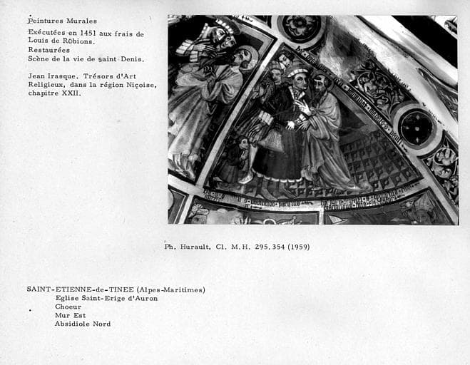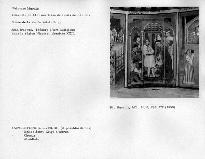 Construite au 13e siècle ou dans la première moitié du siècle suivant, la chapelle actuelle fut enrichie en 1451 d'un somptueux décor peint, dont la date et le commanditaire nous sont révélés par une inscription, mais dont l'artiste, sans doute piémontais, demeure anonyme. Ces peintures à la détrempe recouvrent un décor plus ancien, dont subsistent des vestiges. La chapelle comporte une large nef à charpente apparente, prolongée par deux absides inégales voûtées en cul-de-four et flanquée au sud par un clocher à flèche de pierre probablement plus tardif et par un bâtiment perpendiculaire ajouté au milieu du 16e siècle, l'ancien presbytère. Le décor occupe les deux absides, la niche centrale surmontée d'un baldaquin, le mur oriental de la nef et une partie du mur latéral nord. Les thèmes traités sont : l'histoire de Saint-Erige, le Christ entouré du Tétramorphe, l'histoire de Saint-Denis, l'histoire de Marie-Madeleine, ainsi que des saints, des apôtres, ...