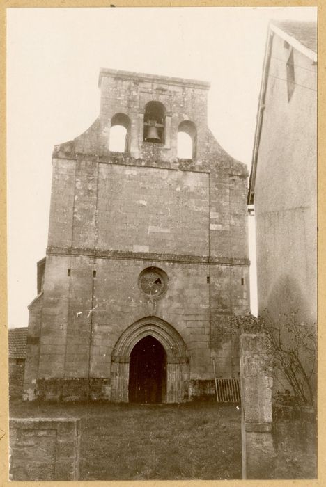 Eglise composée d'une nef barlongue suivie d'un choeur rectangulaire. La nef, dont seul le mur goutterot nord est roman, est voûtée d'un plafond moderne qui coupe le haut de l'arc triomphal. Sur le côté sud se trouve une chapelle voûtée en berceau brisé, qui devait être voûtée d'ogives comme en témoignent deux colonnes engagées dans les angles sud-est et sud-ouest. Un confessional à deux places a été creusé dans le mur nord de cette chapelle. A l'extérieur, la façade occidentale a été remontée au début du 19e siècle, en conservant le portail dont les trois voussures en arcs brisés retombent sur des colonnettes à chapiteaux sculptés, l'archivolte reposant sur des masques. Cette façade s'amortit en clocher-mur à trois baies campanaires plein cintre. Sur le chevet, un clocheton a été monté en 1877, succédant à un ancien clocher-mur à rampants curvilignes percés de deux baies.