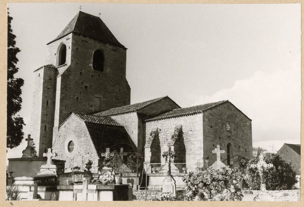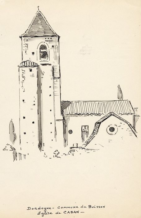 L'église est mentionnée ans le cartulaire de l'abbaye de Cadouin. Elle servait également de lieu de réunion pour les actes solennels et les moines blancs possédaient à proximité des terres exemptes de dîmes. En 1875, Cabans cessa d'exister au profit du Buisson qui devint le centre de la commune avec une nouvelle église paroissiale. Désaffectée en 1880, l'église fut rendue au culte en 1959. ££L'édifice se compose d'une nef suivie d'un choeur barlong. Les trois travées de la nef sont voûtées en berceaux brisés qui paraissent avoir été remontés au 14e siècle. Au sud de la première travée, s'ouvre les fonts baptismaux circulaires. Au nord et au sud de la troisième travée s'ouvrent des chapelles barlongues du 16e siècle, voûtées en berceaux transversaux brisés. Nef et chapelles ont été repercées de baies modernes. Un clocher barlong s'élève sur la travée occidentale, renforcé sur trois de ses angles par des contreforts, celui du sud-ouest se confondant avec la tourelle carrée de l'escalier du clocher. Le portail ouvre sous trois archivoltes constitués de boudins retombant sur de petites bases moulurées supportées par un bahut.