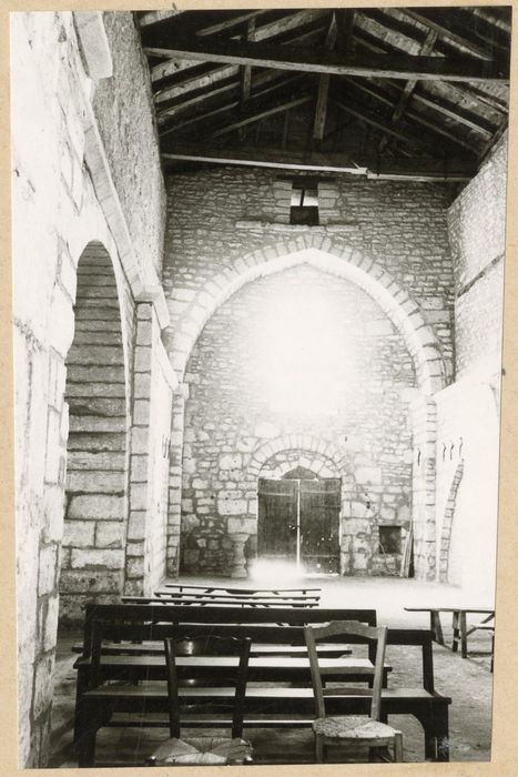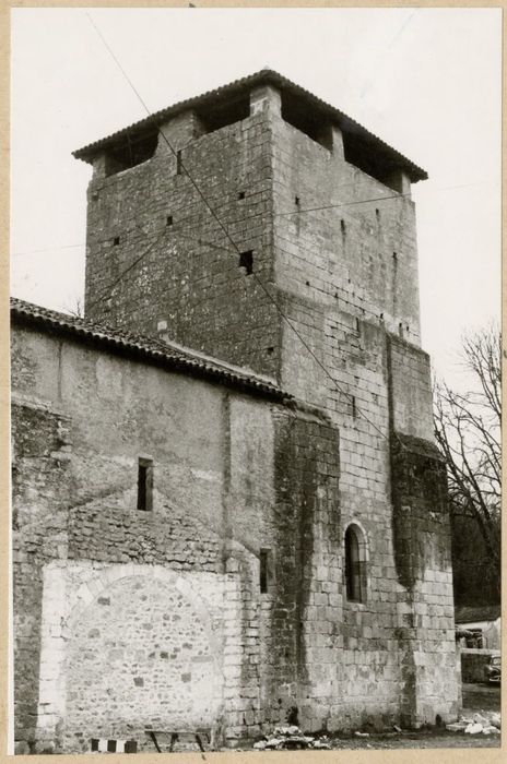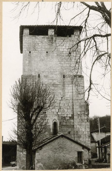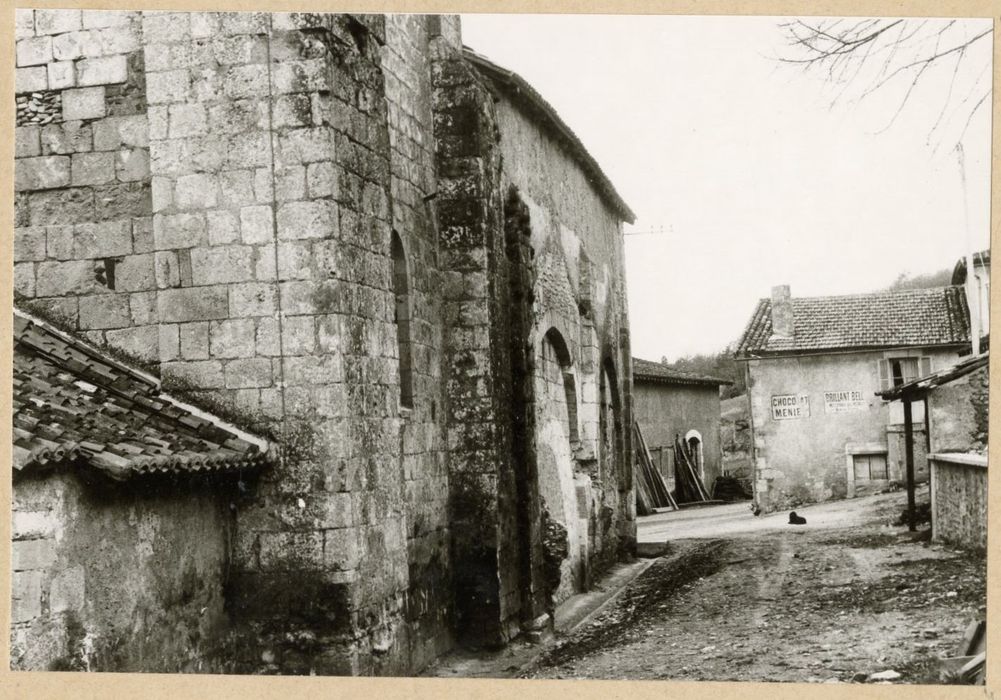 Dès le 12e siècle, une église existait dont il reste le choeur et le clocher. Au 13e-14e siècle, deux chapelles furent élevées sur la face nord, dont il ne reste que les arrachements des arcs d'ogives qui les voûtaient. La guerre de Cent ans obligeant les habitants à s'y réfugier, l'église fut fortifiée par une surélévation du clocher et l'aménagement de chambres de défense.£L'édifice actuel ne comporte plus qu'une nef sans travée, suivie d'un choeur, sous coupole, à chevet plat. Pour répondre aux besoins de défense du 14e siècle, les murs de la nef furent renforcés et leur épaississement soulagé par deux arcs de décharge de chaque côté, et dont le sommet, à mi hauteur, dut servir de chemin de ronde. Dans la pile sud de l'arc qui sépare le choeur de la nef, un escalier a été aménagé, conduisant au chemin de ronde puis aux chambres de défense du clocher, avec un palier ouvrant à la base de la coupole. Le choeur est voûté d'une coupole sur pendentifs. Des traces de peintures qui décoraient le sanctuaire au 18e siècle subsistent. Le clocher carré s'élève sur le côté Est, et constitue le chevet plat de l'édifice. Il est percé de meurtrières correspondant aux chambres de défense. Sur sa face ouest, une petite ouverture donne accès au comble primitif.