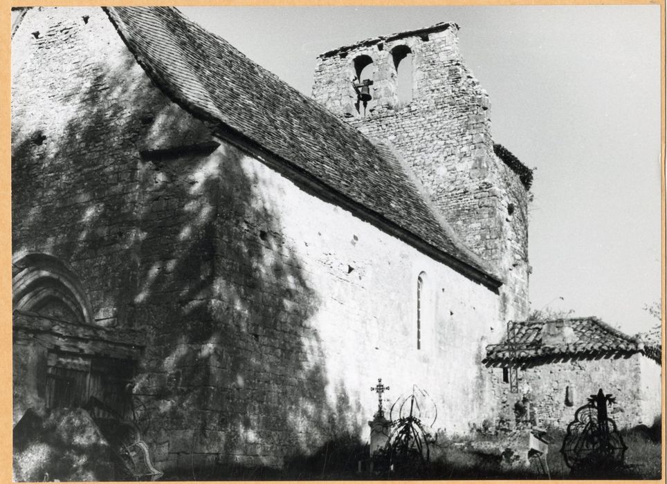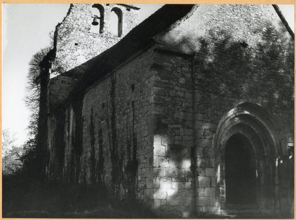 Edifice composé d'une nef suivie d'un choeur à abside semi-circulaire. La nef, reconstruite au 13e-14e siècle, est revoûtée d'un lambris plus tard. Elle ouvre sur le choeur par un arc triomphal. A l'ouest, le portail est composé de trois voussures en tiers point retombant sur des colonnettes (il n'en reste qu'une). Le chevet a été rehaussé d'un haut bahut de défense avec trous de tir, à partir de la corniche à trois rangs de billettes qui soutenait la toiture primitive. Un clocher mur rectangulaire percé de deux baies campanaires s'élève sur l'arc triomphal.