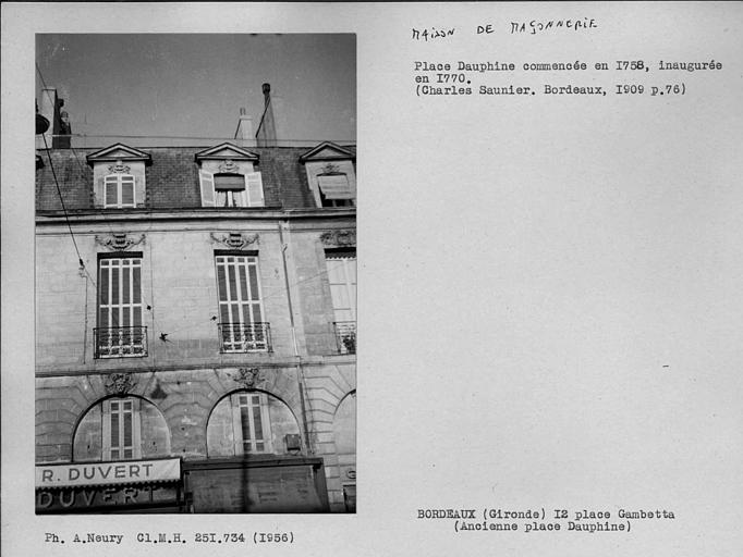 Après la place de la Bourse, celle de Gambetta (ancienne place Dauphine) est l'ensemble architectural urbain le plus important de Bordeaux. Les principales voies y aboutissent. Elle est entourée d'immeubles de la seconde moitié du 18e siècle, bâtis suivant une ordonnance classique. Vers 1745, l'intendant de Tourny, poursuivant son oeuvre d'assainissement et d'embellissement de la ville, ordonna la formation d'une place sur des terrains situés à l'ouest des portes Dauphine et Dijeaux. En 1750, les Jurats contractèrent un emprunt pour fonder et élever les façades des maisons uniformes de la place, composées d'un rez-de-chaussée à arcades portant un étage, un attique et un comble. En 1762, l'architecte fit accepter par l'intendant Boutin un nouveau plan de décor des façades, plus simple que le premier. Il consistait à supprimer les avant-corps prévus et les balustrades, et à surmonter les maisons d'un simple entablement et d'un comble. La place ne fut achevée qu'entre 1770 et 1780, mais le style reste celui de la première moitié du 18e siècle. A chacun des angles de la place rectangulaire s'ouvrent deux artères importantes. L'ordonnance des immeubles comporte une façade de pierre de taille. Au rez-de-chaussée, une arcade régulière avec piédroits à bossages encadrant la porte. Un entresol à petites fenêtres est ménagé dans l'arrondi de l'arcade. Au premier étage se trouvent de grandes portes-fenêtres couronnées de mascarons sculptés et munies de balcons à fer forgé. Quelques immeubles comportent un second étage.