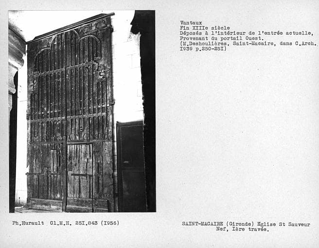 Eglise d'un ancien prieuré bénédictin qui dépendait de Sainte-Croix de Bordeaux. L'église primitive, où avait été inhumé le corps de saint Macaire, fut remplacée par un nouvel édifice consacré en 1040. Ce monument fut entièrement rebâti au milieu du 12e siècle. L'église dut subir les aléas des guerres de Cent ans et de la Fronde. En 1563, la voûte tombait en ruine. En 1579, l'église était acquise par les Jésuites. Au 18e siècle, l'église fut séparée en deux par un mur élevé entre la troisième et la quatrième travée, renversé après l'expulsion des Jésuites en 1781. En 1825, le peintre Sandré retoucha les peintures du 14e siècle. Au 19e siècle, d'importantes restaurations furent réalisées. £L'église présente un plan tréflé. Nef unique de quatre travées. Le transept arrondit ses croisillons en hémicycle, qui n'est en réalité qu'un polygone à onze pans, ainsi que l'abside. Le sanctuaire et le transept sont certainement les parties les plus anciennes de l'église et peuvent remonter au 12e siècle. A la croisée du transept, une coupole jamais construite avait sans doute été envisagée. Des quatre travées de la nef, la dernière est la plus ancienne et pourrait remonter à la fin du 12e siècle. Elle est romane, sauf pour sa voûte. La seconde et la troisième travées sont du 13e siècle. La première travée a été surélevée à l'époque flamboyante et transformée dans ses parties hautes. A l'extérieur, les élévations latérales ont été exhaussées à la suite de la transformation à l'époque flamboyante. La façade occidentale date, pour ses parties basses, du 13e siècle. L'ensemble a été en partie modifié au cours des restaurations modernes. Sur le haut du tympan sont représentés le Christ entre la Vierge, saint Jean et deux anges. Au-dessous sont rangés les onze apôtres. Les voussures sont décorées de feuillages, d'anges, de vierges sages et folles. La partie haute de la façade témoigne de la reprise faite à l'époque flamboyante. Encastré dans le mur se trouve un Chrisme, seul vestige visible de l'église de 1040, avec l'inscription qui donne la date de consécration. C'est au 14e siècle que fut élevé le clocher au nord de la dernière travée de la nef, sur un plan hexagonal.