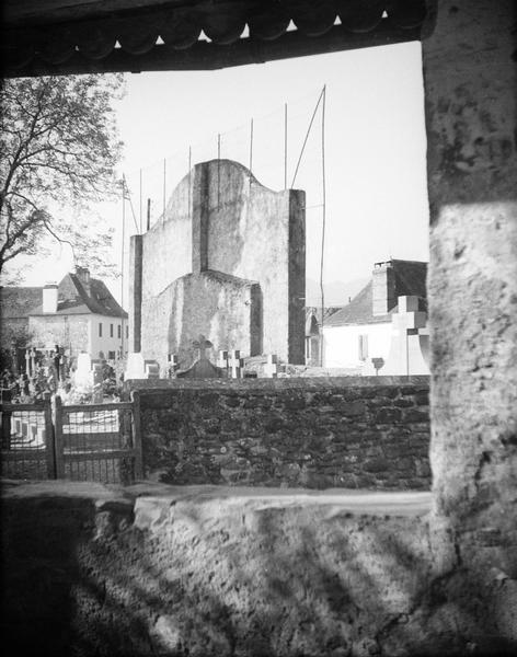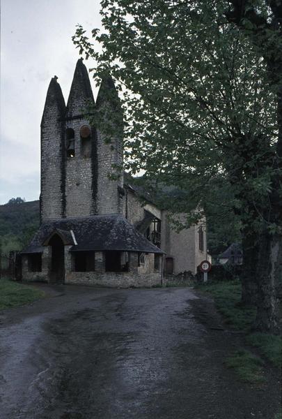 L'église fait partie des églises trinitaires construites au pays basque après la victoire des catholiques sur les protestants pendant les guerres de Religion ou à la suite d'un désastre. L'église comprend une nef précédée d'un porche que surmonte un clocher à trois pignons (clocher trinitaire) caractéristique de l'art basque. Ce type de clocher se retrouve dans l'ancien pays de Soule et en particulier dans la vallée du Saison. La porte percée dans le mur du clocher est formée de trois arcs brisés concentriques. Le cimetière comportait autrefois des tombes discoïdales disparues.