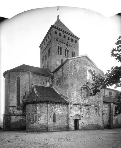 La construction de cet édifice semble remonter à la fin du 12e siècle. Aucune adjonction importante ou de transformation n'a modifié la régularité du plan à trois nefs orientées, terminées à l'est par une abside et deux absidioles. Un transept plus élevé que les bas-côtés et moins que la nef principale dessine la croix latine. Au-dessus de la croisée s'élève une imposante tour carrée qui semble avoir servi de donjon aux époques de trouble. Les chapiteaux décorés de feuillage, sauf un qui comporte des figures, supportent des voûtes d'arêtes à nervures. La tour carrée élevée sur la croisée de la nef et du transept est percée sur chacune de ses faces de trois baies plein cintre divisées en deux par une colonnette de marbre. La surélévation percée de trous carrés ne semble pas se rattacher à la construction primitive. Le portail occidental est formé d'une double arcature sans meneau central, le sommier commun aux deux arcs formant clef pendante. Le tympan est décoré d'un Christ bénissant entouré des symboles des quatre Evangélistes. Le soleil et la lune y figurent également, cette dernière sous l'aspect d'une figure de femme dont les ailes sont en forme de croissant et qui tient un miroir. Une série d'anges décore l'unique voussure qui entoure ce tympan, les colonnettes décorant le large ébarsement qui précède la porte devaient supporter d'autres voussures qui ont été détruites. En avant du portail, un porche a été construit par Lafolhye, architecte du palais de Pau.