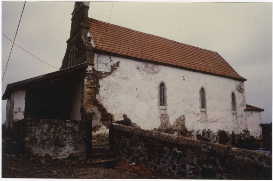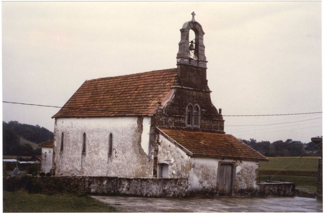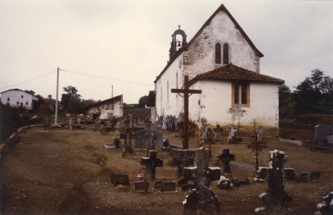 L'église a fait l'objet de restaurations importantes : les percements sont modernes, la façade ouest en avant de laquelle a été construit un porche dallé a été modifiée au 18e siècle puis surmontée d'un clocher-mur en 1875. Malgré les restaurations, elle forme avec le cimetière dans lequel subsistent un certain nombre de stèles discoïdales, et la benoiterie proche, un ensemble particulièrement caractéristique d'un village basque. L'église s'ouvre par une porte sous arc plein cintre sur une nef unique couverte d'une voûte à lambris plein cintre. La sacristie est plaquée sur le chevet plat. La benoiterie est un petit bâtiment de trois mètres sur six, couvert d'un toit en tuiles canal à un seul versant et à grand débord. L'intérieur, à l'origine cloisonné, garde les traces d'une ouverture bouchée sur la façade sud et d'une seconde petite ouverture obturée pour l'aération du grenier. La benoiterie était le logement concédé à titre gratuit par la commune à une benoîte qui avait en charge l'entretien des linges et objets liturgiques, sonnait les cloches, présidait aux mariages, baptèmes et rites funéraires...