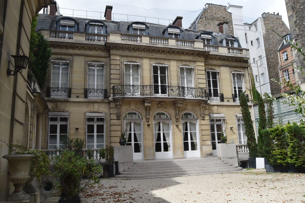 Façades et toitures sur la cour d'honneur ; escalier avec sa rampe en fer forgé ; grande salle de réception : inscription par arrêté du 3 août 1976