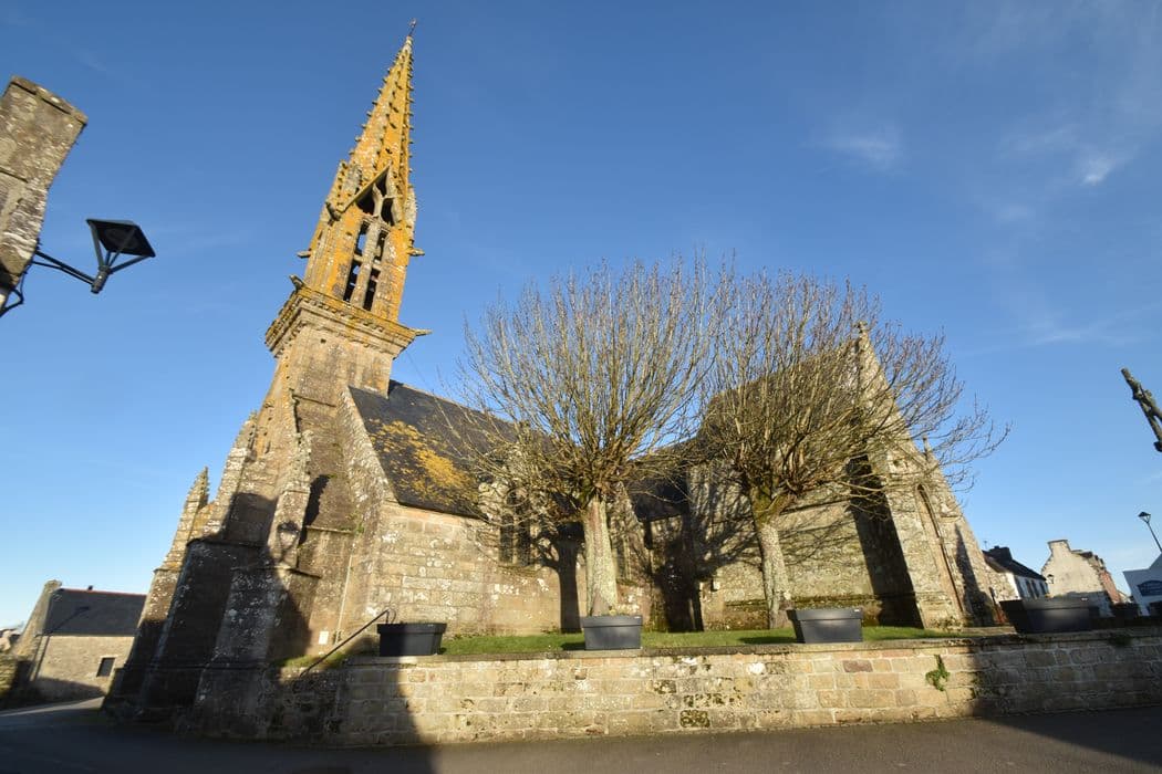 Eglise du 15e siècle, comprenant une nef avec bas-côtés, un transept, une abside polygonale et, sur la façade ouest, un clocher ajouré. Le porche d'entrée se trouve au sud. Portail sculpté sur la façade occidentale. A l'intérieur, voûte en bois aux sablières sculptées. L'édifice a été bâti au centre d'un enclos qui comprenait un arc triomphal, transformé en monuments aux morts au début du 20e siècle, et un calvaire moderne.
