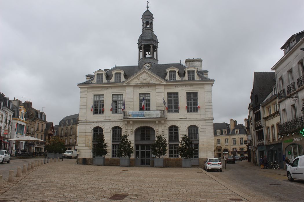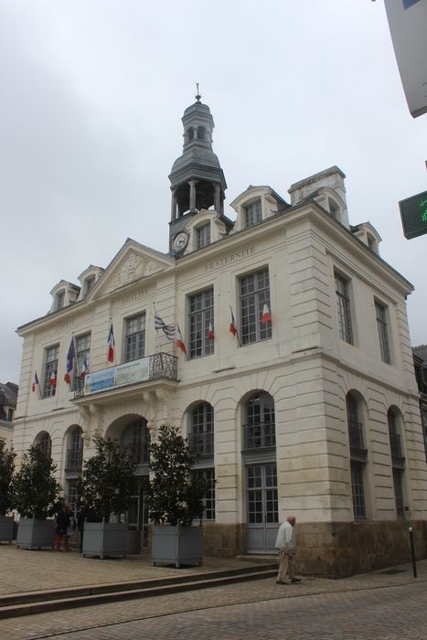 L'hôtel de ville a été construit pour s'adosser aux halles de bois surmontées de l'auditoire de la sénéchaussée, aujourd'hui disparues. Les plans de 1772 seraient de M. de Saint-Pierre, ingénieur du Roi et de la Compagnie des Indes à Lorient, repris en 1775 par Detaille de Kerroyant et exécutés de 1776 à 1782 en pierre de Taillebourg.