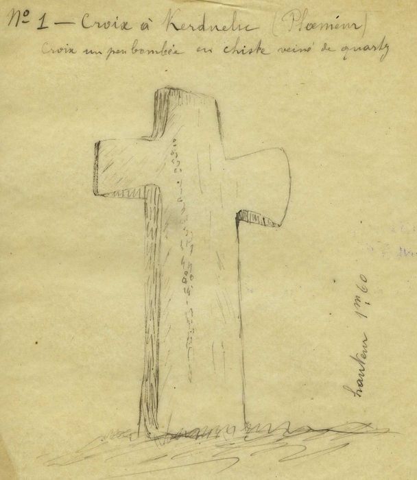 Croix plate, aux bras pattés, en schiste veiné de quartz. Elle est légèrement bombée. Elle semble remonter au début de la période chrétienne.