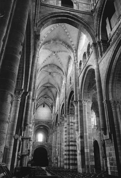 En 389, le simple oratoire dédié à Saint-Julien, devient église. Détruite en partie par les Arabes au 8e siècle, la basilique est relevée par Béranger, comte de Toulouse et comte bénéficiaire d'Auvergne, qui commença les travaux vers 820. L'oeuvre est achevée en 893 par Guillaume le Pieux, duc d'Aquitaine. En 924 et 927, l'église est à nouveau détruite par les Normands. Une campagne de travaux est menée au 13e siècle. Narthex daté de la fin du 11e siècle. Tribunes du narthex et première travée du bas-côté sud, vers 1120. Porche sud, quatre premières travées de la nef et celles des bas-côtés qui leur correspondent, piles de la croisée, vers 1130. Coupole de la tribune du narthex, du milieu du 12e siècle. Porche nord, cinquième travée de la nef, croisillons, lanterne du transept avec sa tour octogonale, choeur, de la fin du 12e siècle. Quatrième et cinquième voûtes d'ogives de la nef du milieu du 13e siècle. Voûtes et fenêtres des trois premières travées, datées du 14e siècle. En 1793, destruction de la tour carrée et démolition de la flèche de la tour octogonale, haute de 33 mètres. Lors d'une campagne de travaux menée de 1848 à 1850, l'architecte Bravard reconstruisit la tour carrée du narthex et couvre de terrasses la nef et les bas-côtés. Entre 1862 et 1864, l'architecte Mallay consolide le clocher octogonal qui surmonte le transept et le coiffe d'une flèche. En 1907 est entrepris le débadigeonnage des fresques des absidioles qui reste se poursuit en 1957 avec la mise à jour des peintures murales de la nef. En 1964, rétablissement de l'ancien pavage de galets polychromes découvert à 40 cm sous le suivant. ££A l'origine, la garde du tombeau du saint était assurée par 80 chevaliers formant une milice guerrière qui devint ensuite un corps de chanoines. Puis, l'église fut desservie par 54 clercs qui reçurent de Louis le Débonnaire la règle des chanoines réguliers. Ces chanoines formaient un chapitre qui était seigneur de la ville et du comté, avec droit de haute, moyenne et basse justice. Ces prérogatives se maintinrent jusqu'à la Révolution.