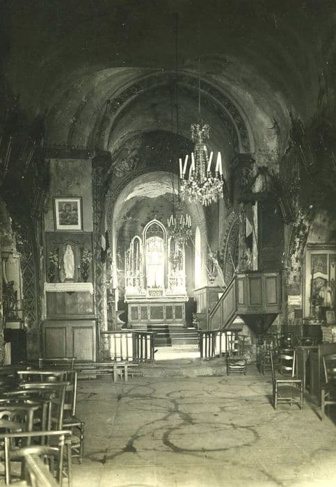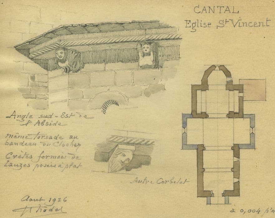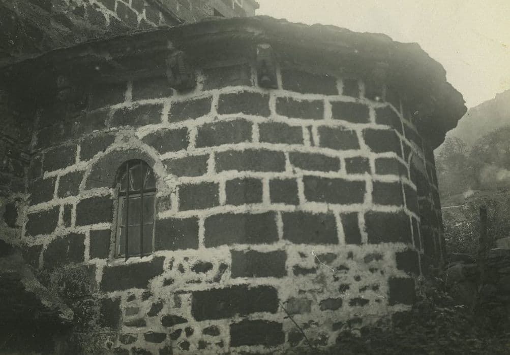 Eglise de la fin du 12e siècle, à laquelle furent ajoutées au 16e siècle les chapelles de la troisième travée de la nef. Le second étage du clocher et le petit porche sont de la même époque. L'édifice est entièrement voûté en berceau. L'abside a la particularité d'être à cinq pans intérieurement et à sept pans extérieurement. La corniche possède encore tous ses corbeaux sculptés de sujets profanes, volontairement détruits dans les autres édifices. Les pentures de la porte sont anciennes. Elles se terminent par des têtes de chiens et portent sur les plats des ornements gravés. Le clocher carré, ajouré sur ses quatre faces, repose directement sur le choeur. Ce monument est un bon exemple d'église rurale de la Haute Auvergne, d'aspect archaïque.