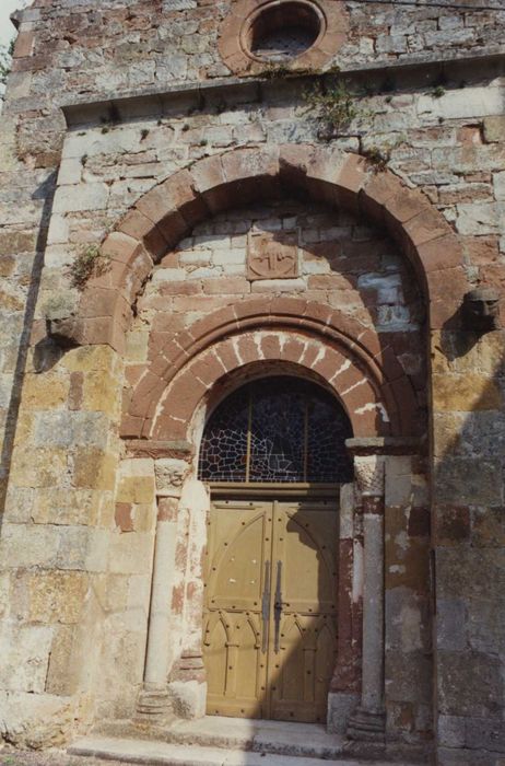 Eglise construite au 12e siècle par les Hospitaliers pour leur usage personnel et celui des gens de leur domaine. La nef de trois travées est voûtée en berceau. Un transept saillant est voûté en berceau transversal ; les bras abritent des chapelles. Le choeur se termine par une abside semi-circulaire éclairée par trois baies. Le portail occidental, sous un arc en plein cintre, est formé d'un double cintre mouluré reposant sur deux chapiteaux sculptés d'entrelacs et de feuillages. Au-dessus se trouve une croix ornée d'une main de justice, et de chaque côté, deux têtes de lions. En 1878, remontage de la tour octogonale du clocher, et surélévation des parties hautes des murs latéraux, du transept et du chevet.
