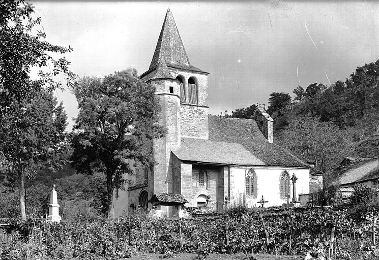 L'église aurait été construite par les moines d'Aubrac, ce qui semble confirmé par la présence de ce monument loin de tout centre important. Cet édifice était sans doute une dépendance de la dômerie d'Aubrac. Il existe, derrière l'église, un bâtiment du 15e siècle ou remanié à cette époque, sorte de prieuré contemporain des constructions d'Aubrac. Le plan de l'église semble remonter au 12e siècle. L'abside se compose de cinq pans inégaux alternant avec des arcatures. Les absidioles se terminent par un mur droit. Les travées de la nef ont été revoûtées au début du 15e siècle. Les chapelles latérales et le clocher datent de cette époque. Petit campanile sur l'arc triomphal. L'église s'ouvre par quatre portes, toutes du 12e siècle. Le portail occidental devait être précédé d'un porche. Tous les chapiteaux sont historiés (animaux, personnages, feuillages).