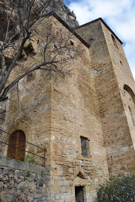 Eglise fortifiée, en partie enclavée dans une haute muraille rocheuse dominant la vallée du Tarn. Le mur qui la ferme d'un côté, comporte des travaux de défense (meutrières, bretèches). La voûte est constituée par une grotte naturelle. Un écusson chargé d'un animal fantastique, moitié licorne, moitié chèvre, est reproduit deux fois dans la construction et devait être le sceau de la communauté. Peyre était le siège d'un important prieuré. Des inscriptions indiquent des travaux en 1594 et 1609.