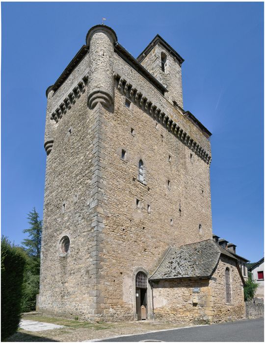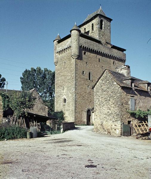 Eglise fortifiée. Sur une nef du 13e siècle a été élevé au 14e siècle un donjon couronné de mâchicoulis et flanqué de deux tourelles en encorbellement sur la face ouest. Un petit clocher a été placé au centre. Le donjon comprend plusieurs étages. Chaque étage comprend plusieurs chambres ouvrant sur un couloir central. Les murs conservent des traces de décoration peinte.