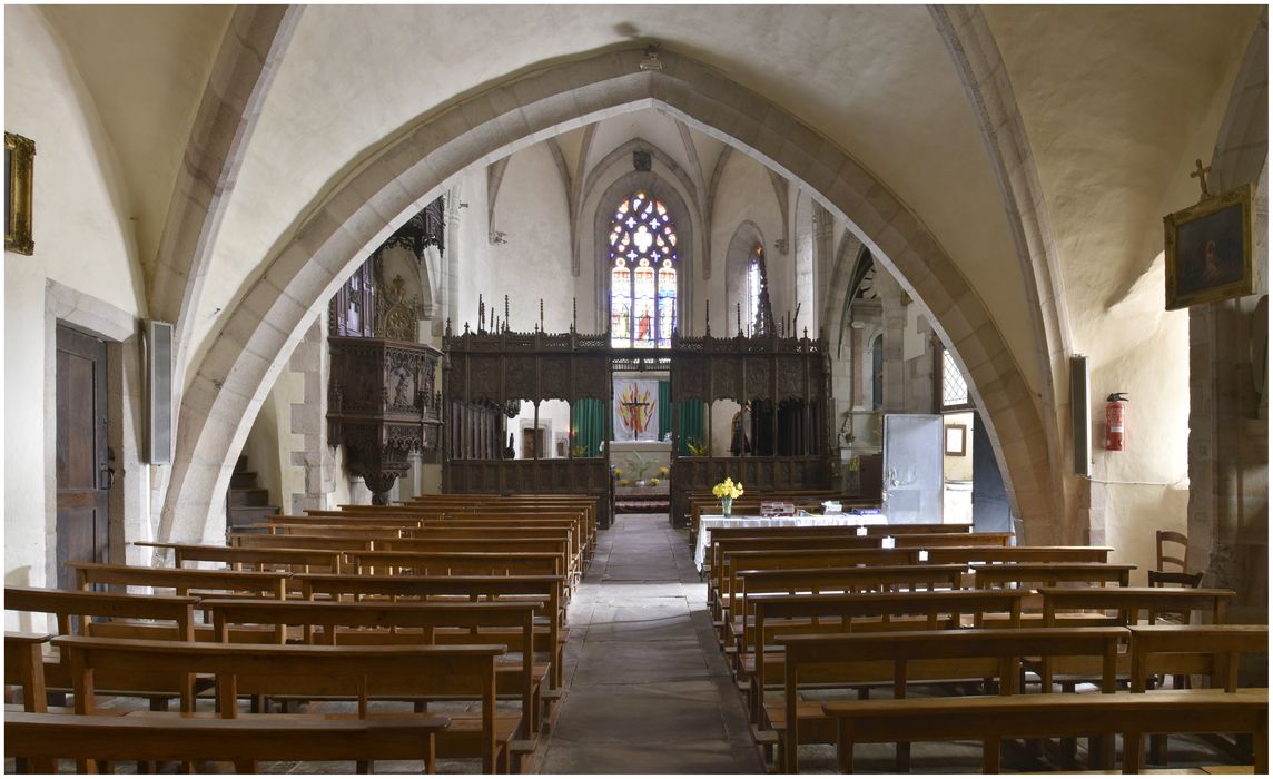 L'église a été rebâtie, dans ses parties essentielles, par Guillaume de la Tour, évêque de Rodez. En 1466, l'église est érigée en collégiale et son chapitre se composait de six chanoines. La tribune a été ajoutée à la fin du 15e siècle. La première chapelle nord présente une voûte en étoile. A l'extérieur, deux contreforts circulaires contrebutent la poussée de la voûte de cette chapelle. Le clocher est moderne dans ses étages supérieurs. Les vitraux sont un don de François d'Estaing, évêque de Rodez (1504-1529).