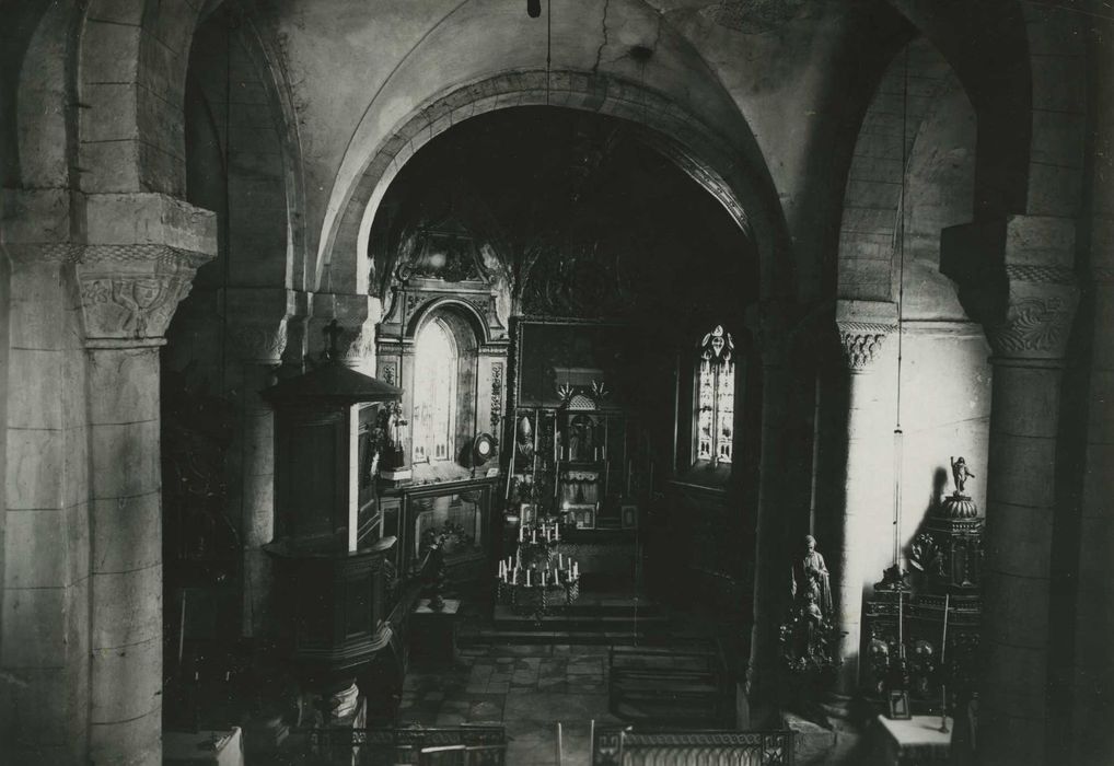 L'église se compose d'une nef, un transept et un choeur polygonal. La nef, primitivement voûtée, a été couverte d'un plafond au 19e siècle. Au bas de la nef existe une vaste tribune du 15e siècle reposant sur des voûtes de cette époque. Le transept du 12e siècle repose sur quatre arcades plein-cintre qui supportent une voûte refaite au 16e siècle. Le choeur pentagonal est couvert d'une voûte de bois avec pendentif, datée de 1562. Chapiteaux romans.