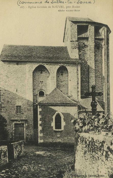 La paroisse est mentionnée dans un cartulaire de Conques entre 1087 et 1107. L'église actuelle date du début du 13e siècle. En 1249, le prieuré de Souyri fut uni à la manse du chapitre de Rodez. L'église devait comprendre, à l'origine, une nef unique avec choeur et abside circulaire voûtée en cul de four. Un doubleau reposant sur deux grosses piles et formant arc triomphal, sépare le choeur de la nef. A l'étage se distinguent les trois arcades du clocher-mur primitif qui était construit au-dessus de l'arc triomphal. Egalement à cet étage, restes de chapiteau double à entrelacs, indiquant que la nef romane était à trois travées séparées par des colonnes doubles. Au 14e siècle, l'église a été fortifiée pour devenir un donjon. L'épaisseur des murs de l'abside a été augmentée, les contreforts renforcés, l'ensemble étant devenu la tour principale de la forteresse. Au dernier étage, sous les abat-sons modernes, se voit encore un corbeau qui devait soutenir un mâchicoulis. A l'ouest, le clocher arcade renforcé, muré, surélevé, est devenu l'une des faces de la tour. Les murs de la nef ont vu leurs contreforts renforcés et reliés en tête par des arcs laissant un vide avec le mur pour former assommoir. Les fenêtres ont été en partie bouchées, des meurtrières établies et une voûte sur croisée d'ogives de peu de hauteur a remplacé la voûte romane, laissant au-dessus d'elle un espace libre qui a été divisé par des cloisons pour former une chambre sûre à l'usage de chaque famille importante du pays. Elles étaient desservies en colimaçon creusé en partie dans le mur sud, près de la porte d'entrée. Un arc ogif avait été dévié pour le laisser passer à travers la voûte. Cette disposition a été modifiée lors de l'établissement de la tribune moderne. Au 19e siècle, ajout d'une chapelle au nord et une autre au sud. L'entrée a été modifiée (l'entablement porte l'année 1841).
